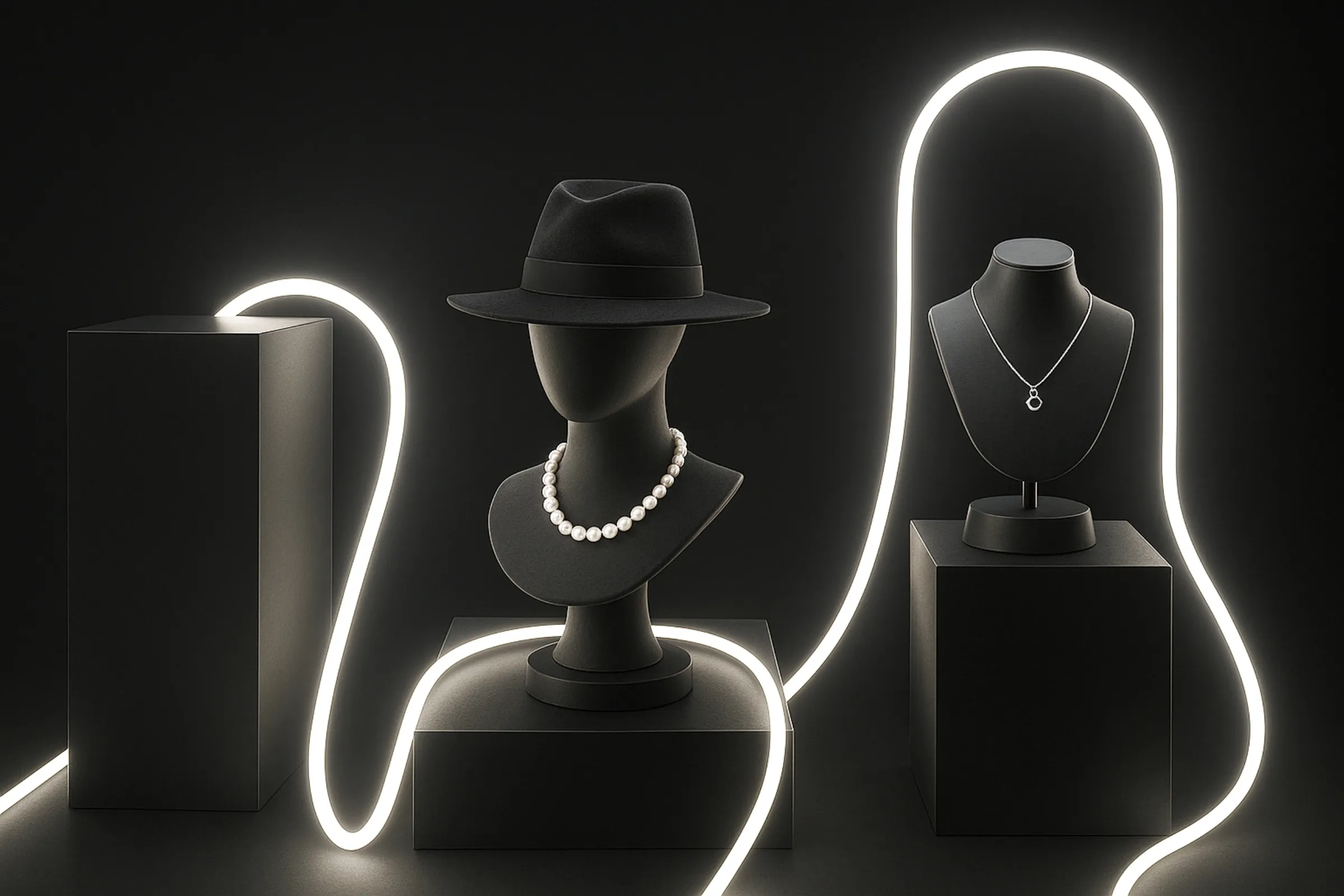 TUBE360を天井に吊り下げることで、通常の照明器具とはまた違う彩りを空間に加えることができます。また、直線的ではなく曲線で文字を表現したいときにも活躍します。TUBE360の立体感と全周発光で独特な文字の表現が可能になります。それだけでなく、ディスプレイなどの主役を引き立たせるための装飾としてもオススメです。