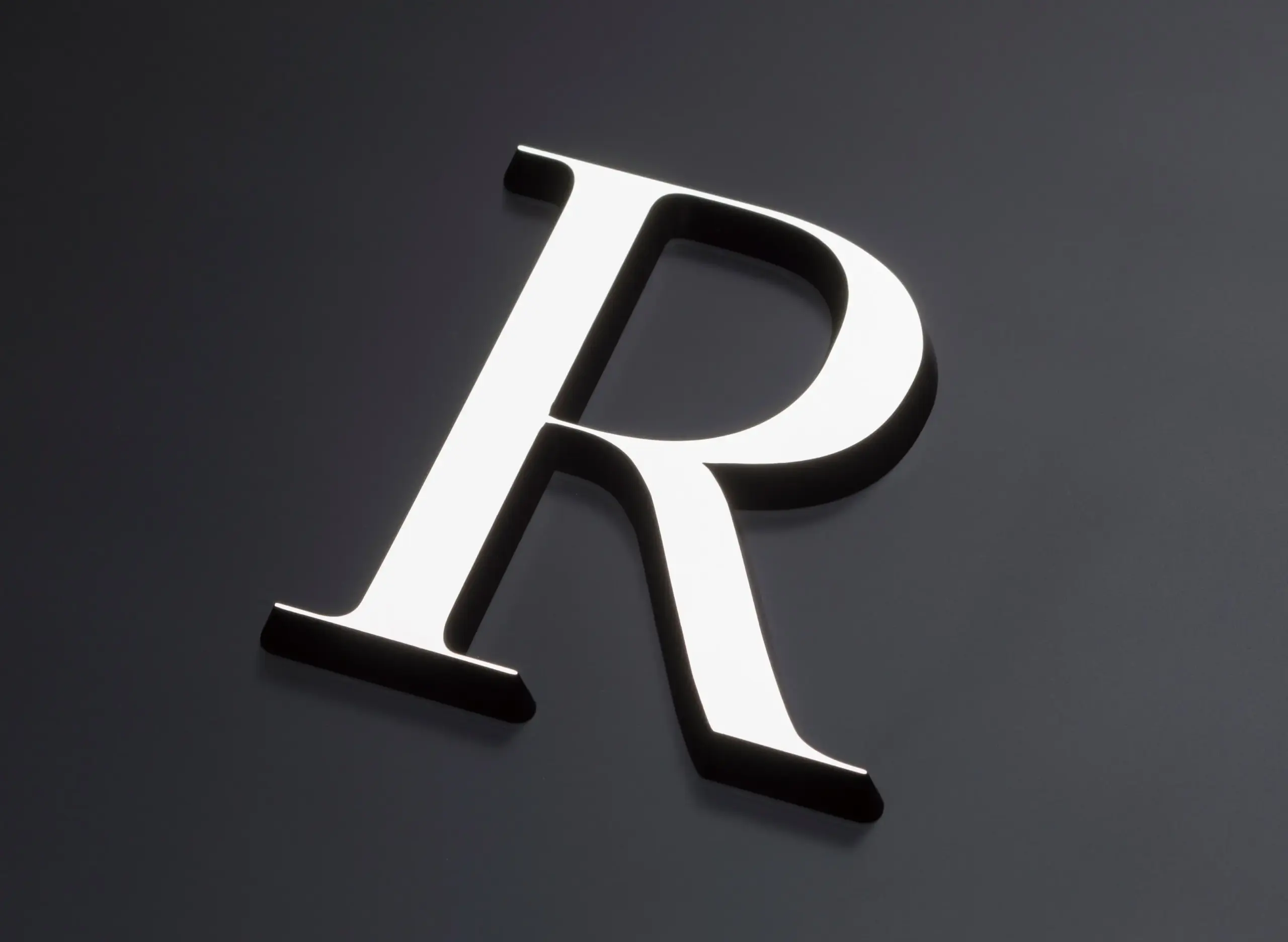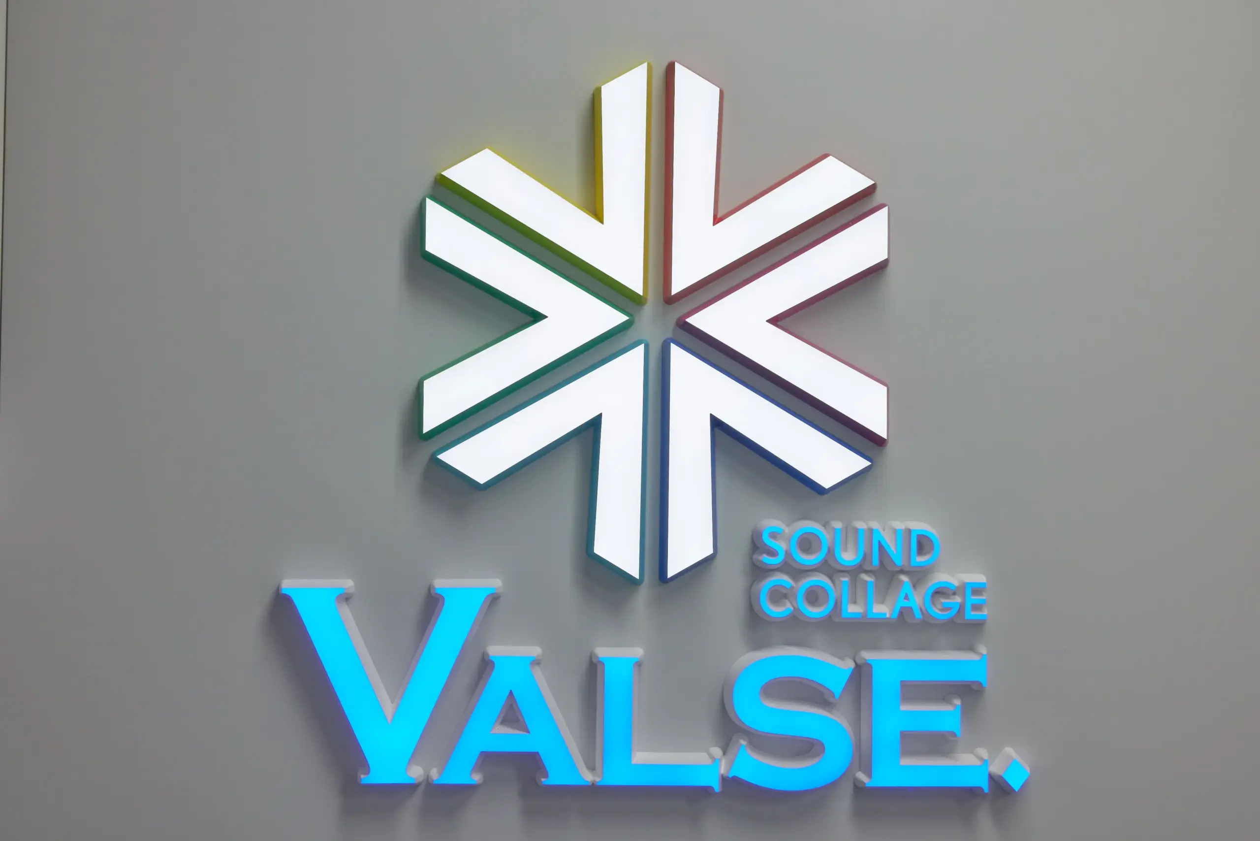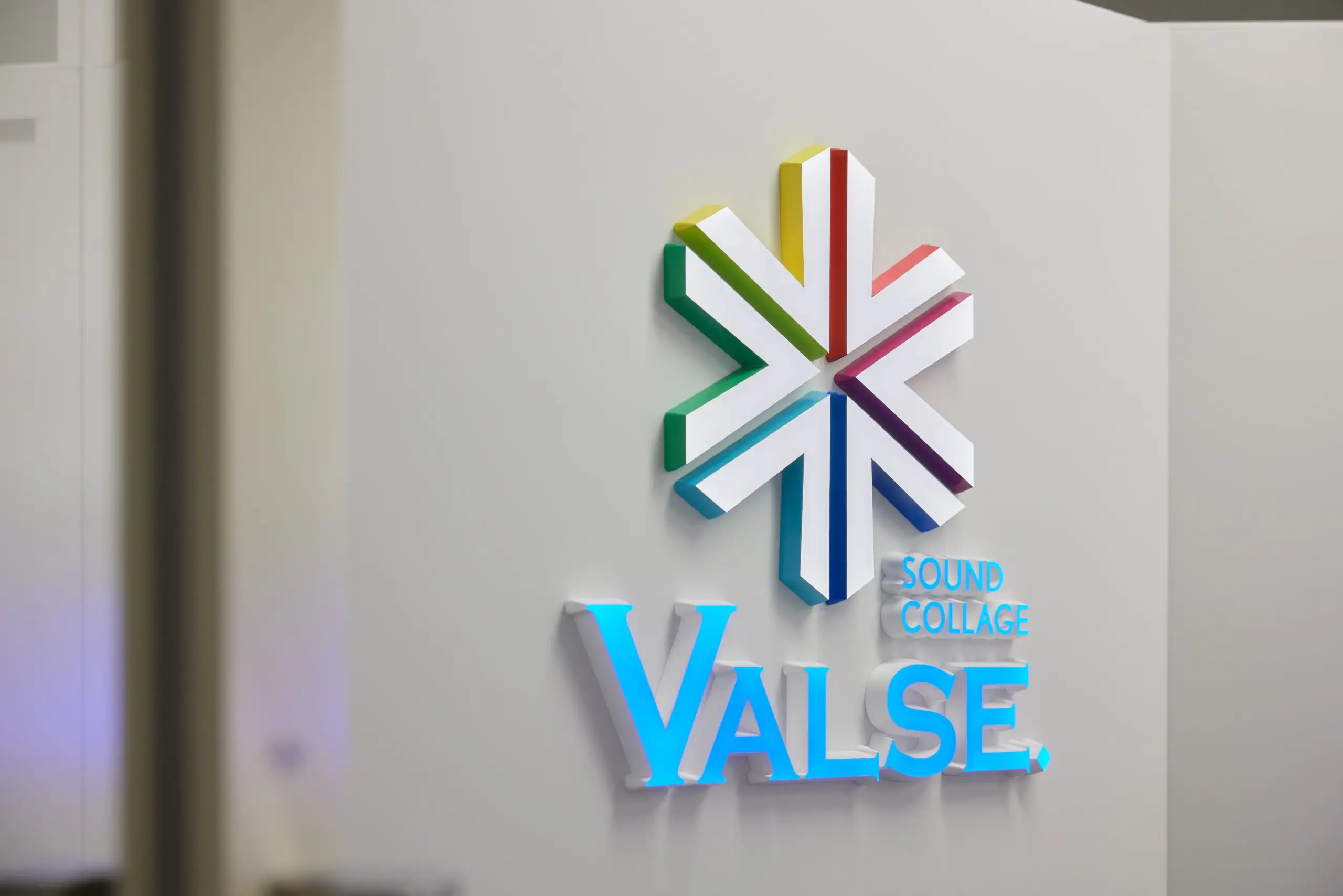 ロゴの発光面は白、側面の塗装はパーツごとに6色で表現された施工例。“DIGITEC SIGN SMART”の特徴である側面の傾斜が活きており、正面から見ても側面の塗装色がかすかにのぞくことで、さりげなくも確かに色を表現しています。また、正面が白、側面がカラーのロゴとは対照的に、正面を水色一色、側面を白で仕上げた社名サインも、会社のイメージが伝わりやすい構成となっています。またテーパー形状が立体感の演出にもつながり、室内の白を基調とした明るい空間の中でも、しっかりとした存在感を生み出しています。