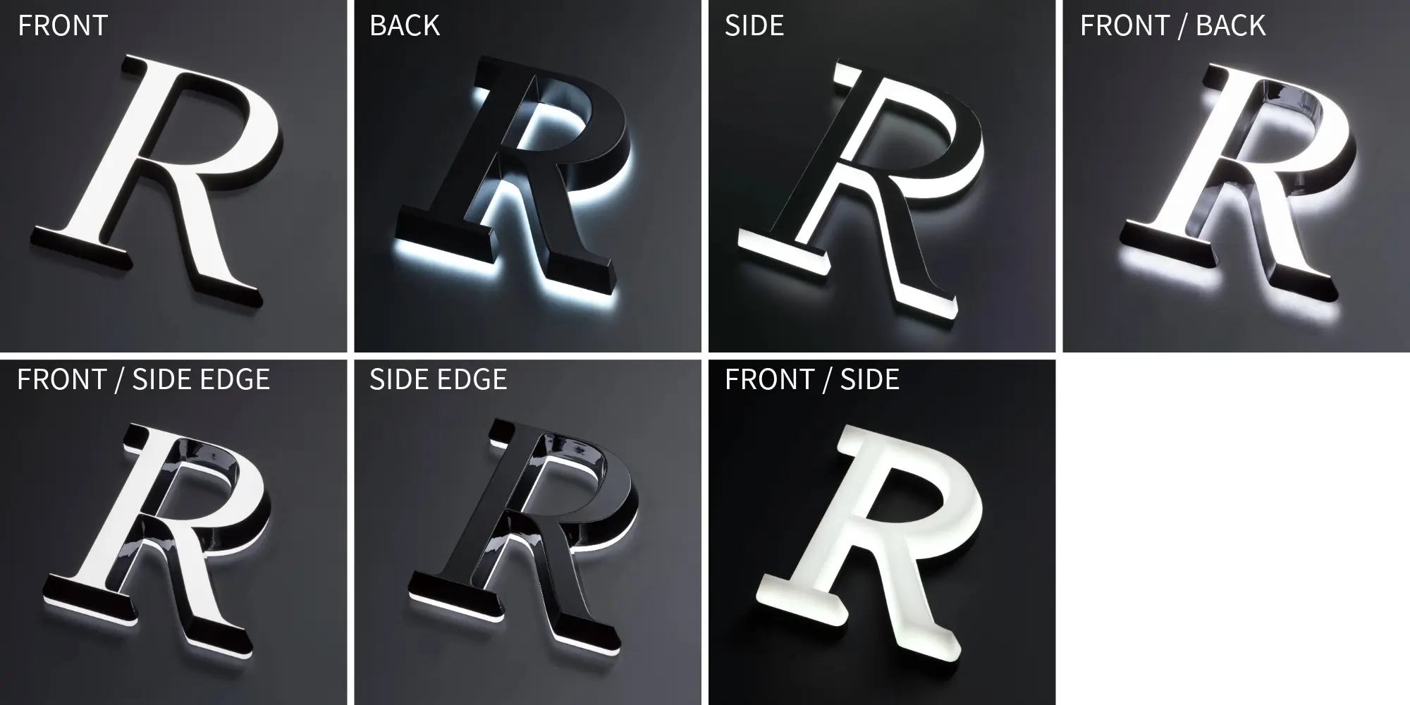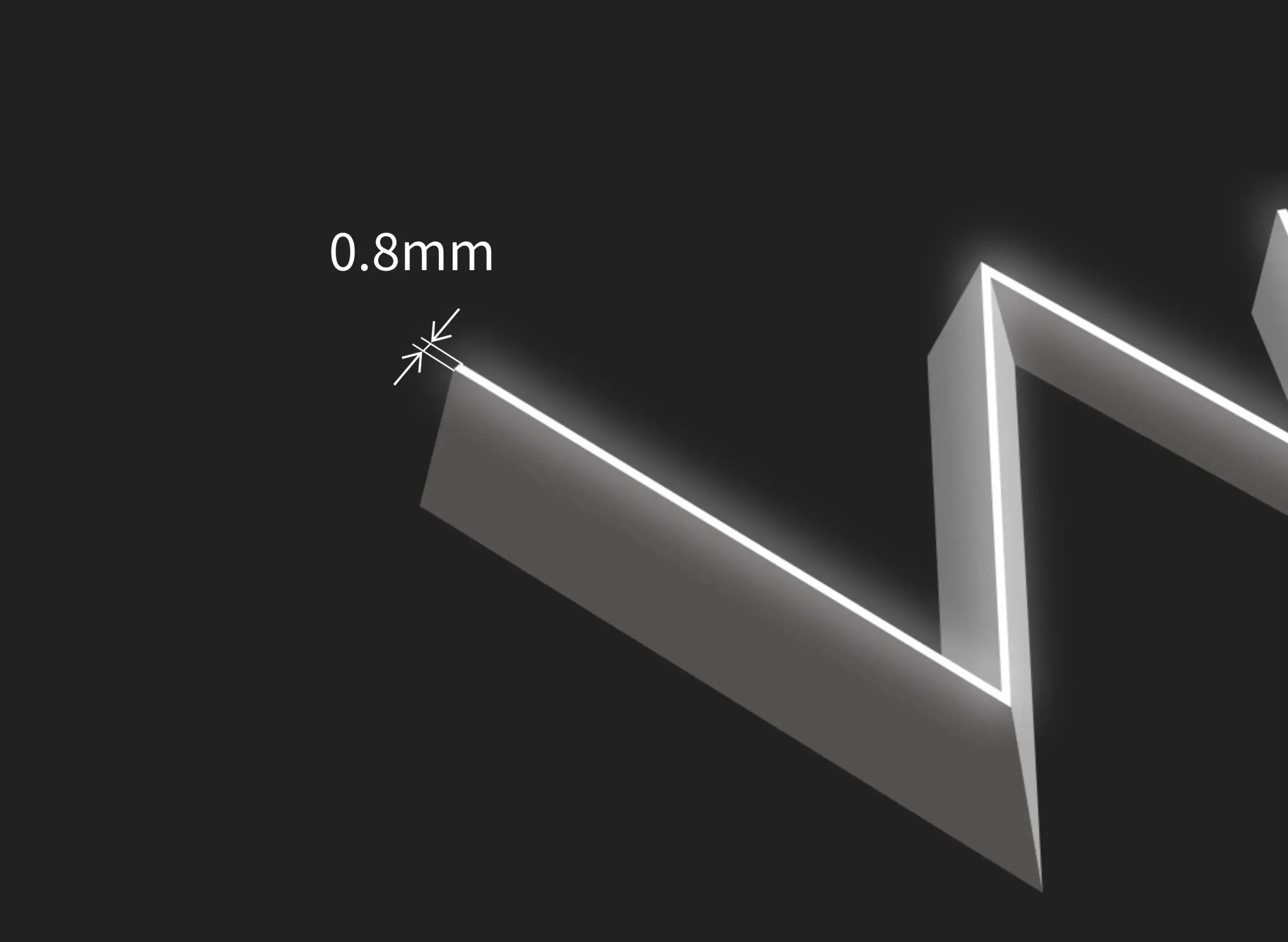 “DIGITEC SIGN SMART”は、断面がストレートなデザインの“PRO”とは異なり、側面に傾斜をつけてカットしているのが特徴です。この傾斜により発光面と光源の幅に差をつけられ、従来の仕様だと不可能だった意匠が細かいデザインや極細の字体も再現できるようになりました。発光面は最細で0.8 mm、文字高さも最小30mmと、とても細くて小さいサインでも再現できます。LEDの発光色は12種類から選べ、発光仕様は、FRONT(正面発光)・BACK(背面発光)・SIDE(側面発光)・FRONT/BACK(正面/背面発光)・FRONT/SIDE EDGE(正面/側端発光)・SIDE EDGE(側端発光)・FRONT/SIDE(正面/側面発光)の7種類で展開しています。