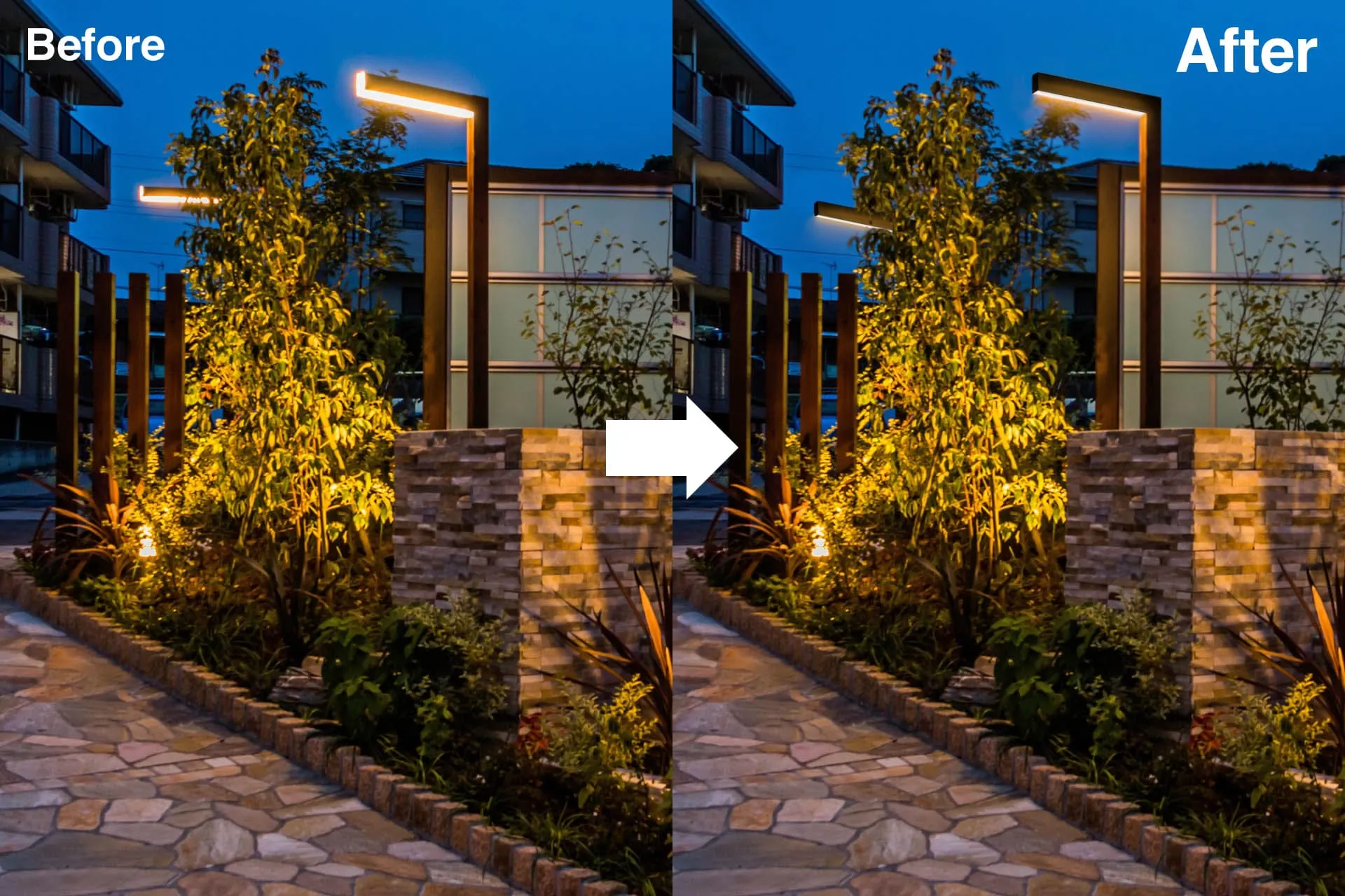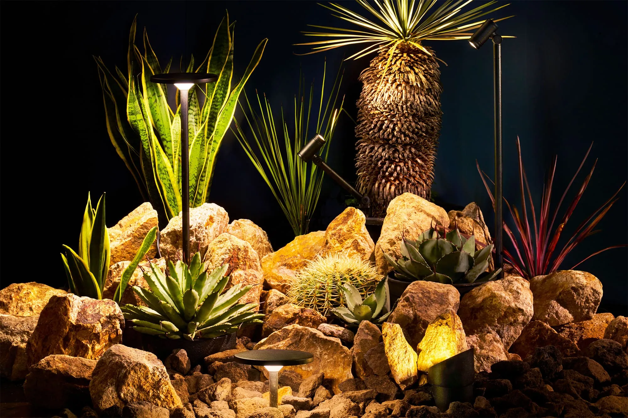 灯具をブラックで統一することで、器具の存在感をおさえ、植栽や建築素材が持つ本来の色味や質感を主役にするすっきりとした空間演出が可能になります。近年注目されるドライガーデンのように、土・石・植物のコントラストを活かした外構デザインとも相性が良く、風景に対して自然に溶け込みます。ほかにも外構やアプローチ、テラスなど幅広いシーンに調和し、光で照らされた空間を引き立たせた演出が可能です。