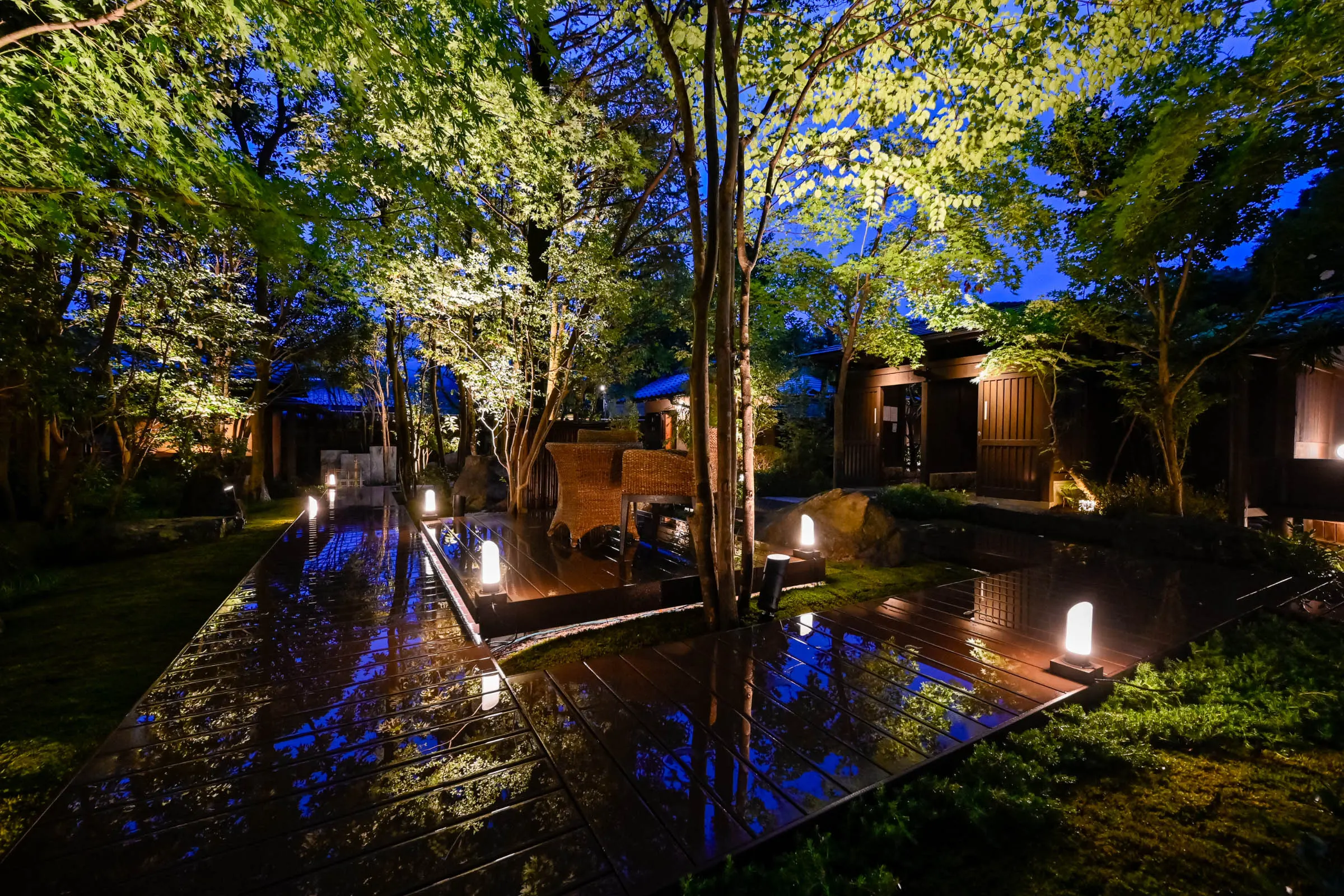 続いて山下さんが紹介してくれたのは、岐阜の温泉旅館。四季折々の景観が楽しめる宿自慢の庭園回廊に、リフレクション(反射)効果でデッキの色味を出したライティングを施しました。特にこだわったのは雨の日に特別に見える仕掛けを作ること。本来はあまり目を向けられない悪天候を逆手にとり、雨が降ることで周辺の水辺やデッキに水鏡のように光が映り込み、仮想現実のような世界が広がるように設計。これにより、雨が特別な価値を持つようになりました。