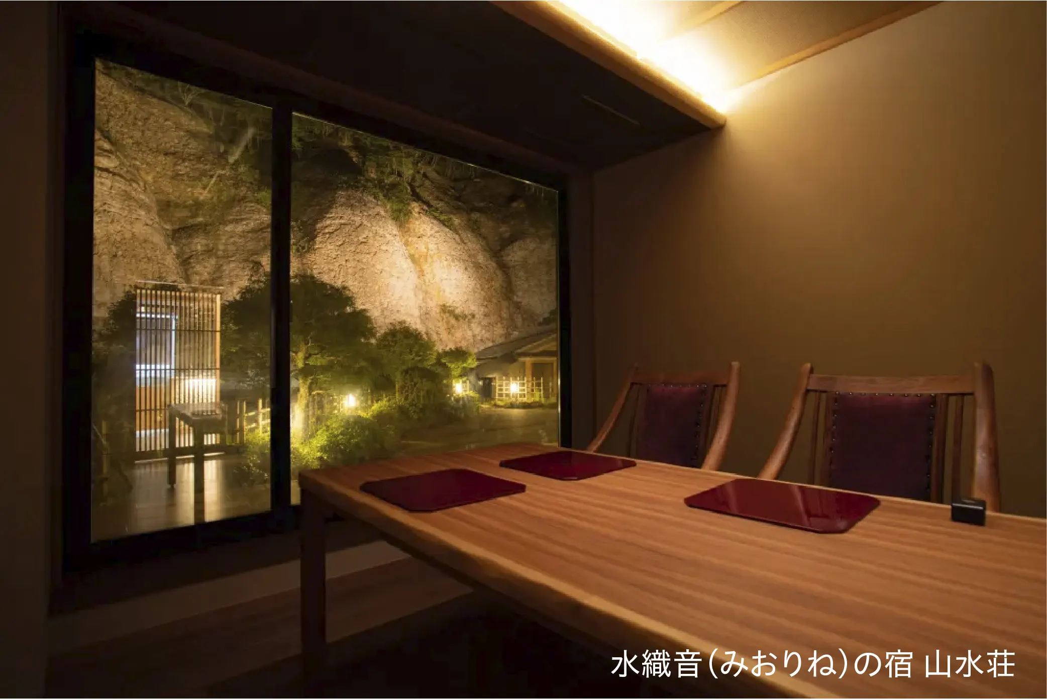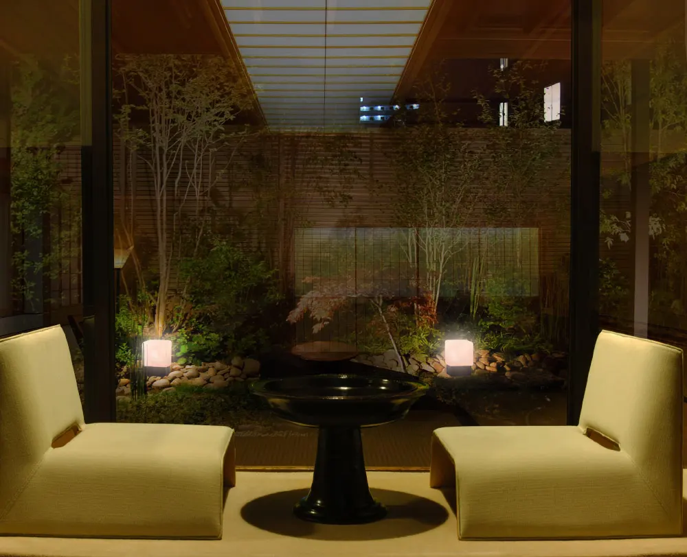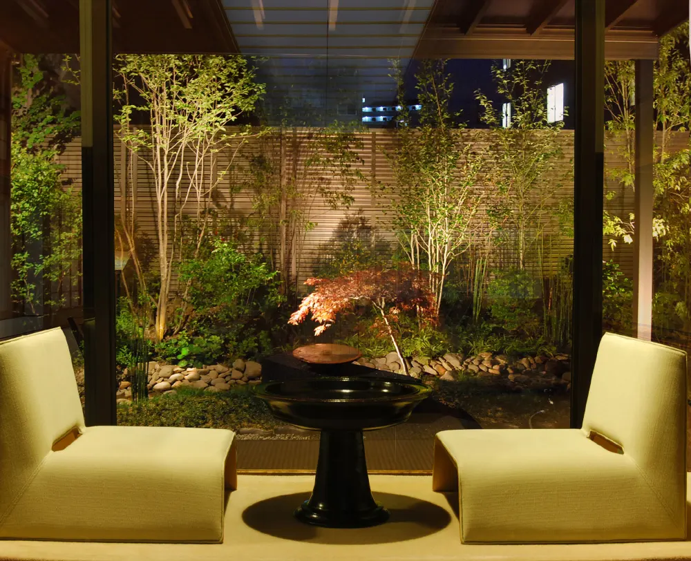 また「内装材を組み合わせた光と素材の組み合わせ」の例として甲斐さんが紹介してくれたのが、南福岡のカフェです。こちらでは上下が障子とガラスに分かれた雪見障子越しに坪庭を見ることができるのですが、さらに踏み込んだ景色づくりのため行燈をおいて幻想的な雰囲気を作りつつ、デジテックの製品であるデザイニングスポットライトであえてムラのある光を投影するという手法を使ったそう。時間によってお店の人に障子の上げ下げをしてもらうことで、会話だけを楽しんでいたお客様も庭の景観を眺めて楽しむようになったそうです。