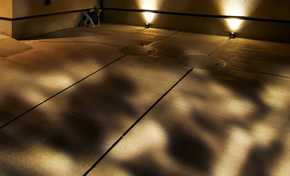 近年飛躍的に発展を遂げてきた屋外照明。特にこの20年ほどで生活の変化に呼応するように屋内、そして屋外の照明手法が変化し続けてきました。その変化はわかりやすく言うと、暗いところを明るくする『機能的な光』から空間を作る『演出の光』への移行です。「空間全体を明るく照らし、しっかりと明かりをとるのがひと昔前の照明。そして、樹木や壁を見せたいという意図をもって、照明器具が目立つのではなく照らされた対象物が主役になるのが最近の主流。これまでの流れを引いた目から見た時のひとつの流れです」と花田さんは話します。