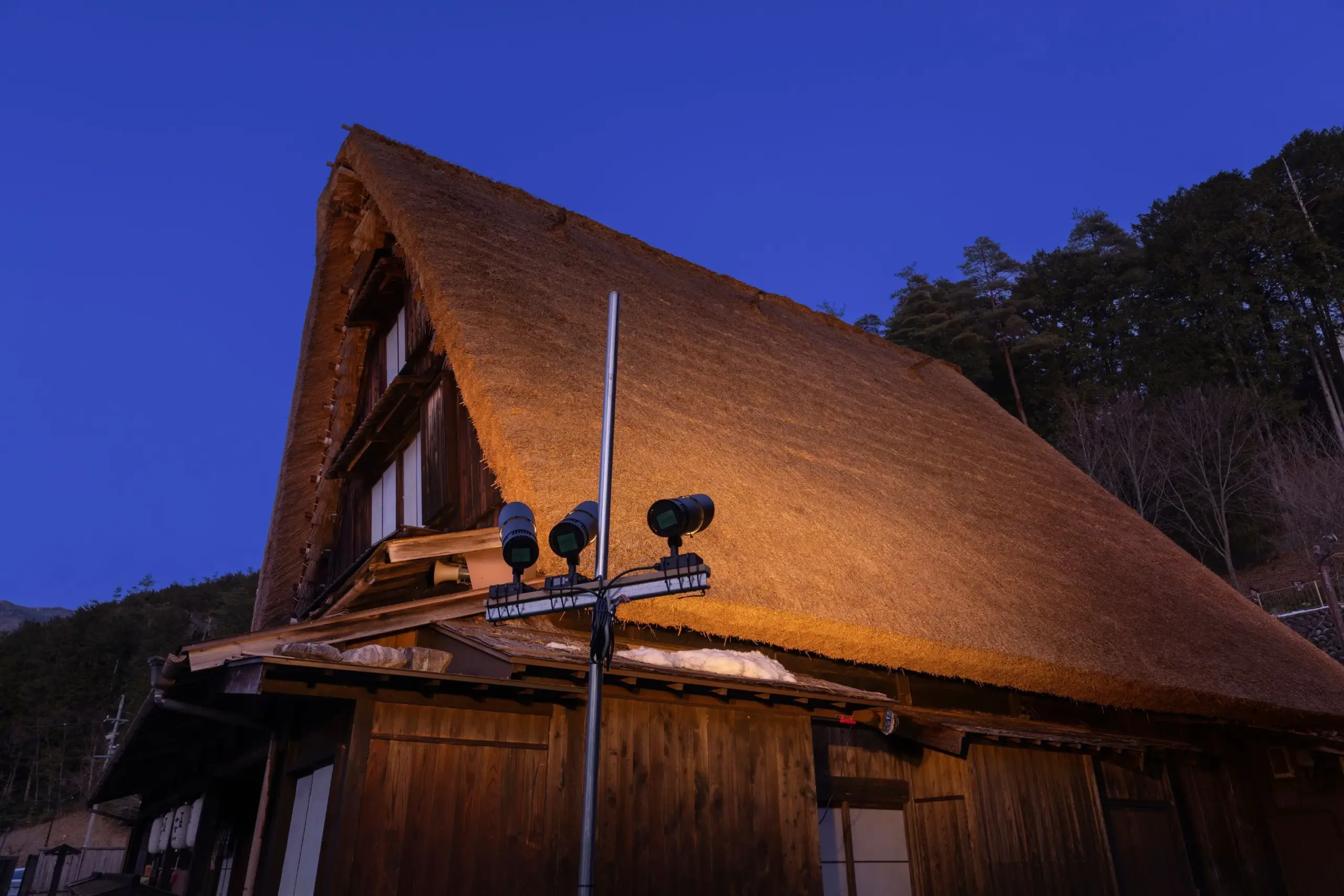 これまでのライトアップは、水銀灯を用いて建物の四隅から照射するシンプルな構成でした。一見すると簡単に明るくなるのでわかりやすい手法ですが、逆に捉えると、合掌造り特有の構造や素材感、茅葺き屋根の質感までを丁寧に表現するには限界がありました。また水銀灯はエネルギー効率もよくないため、これまでイベントとして短期間のライトアップしか行われてきませんでした。