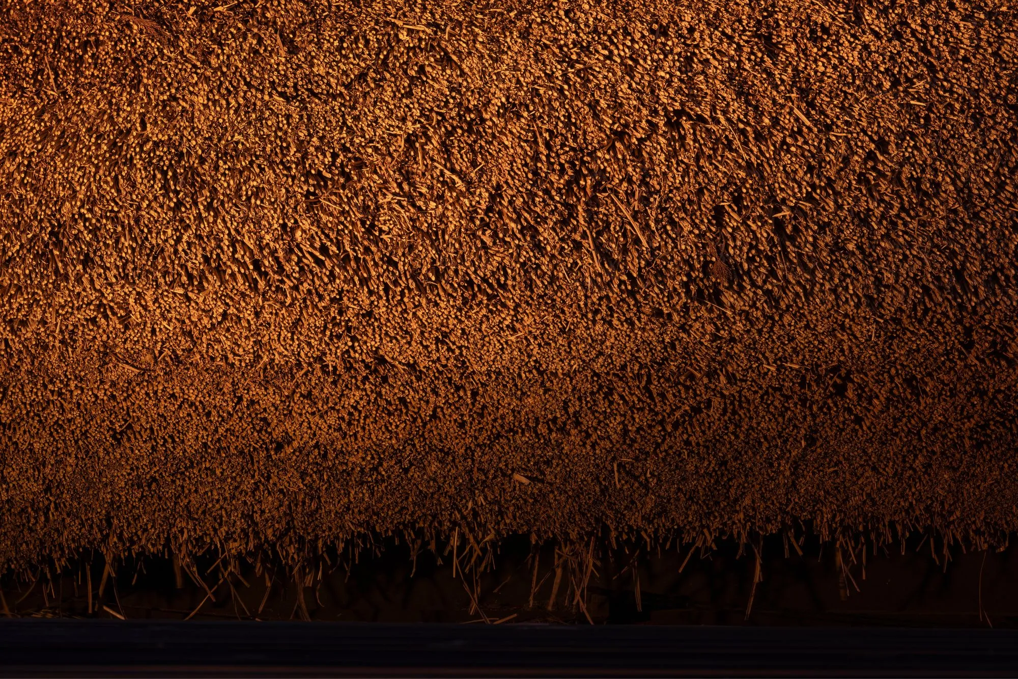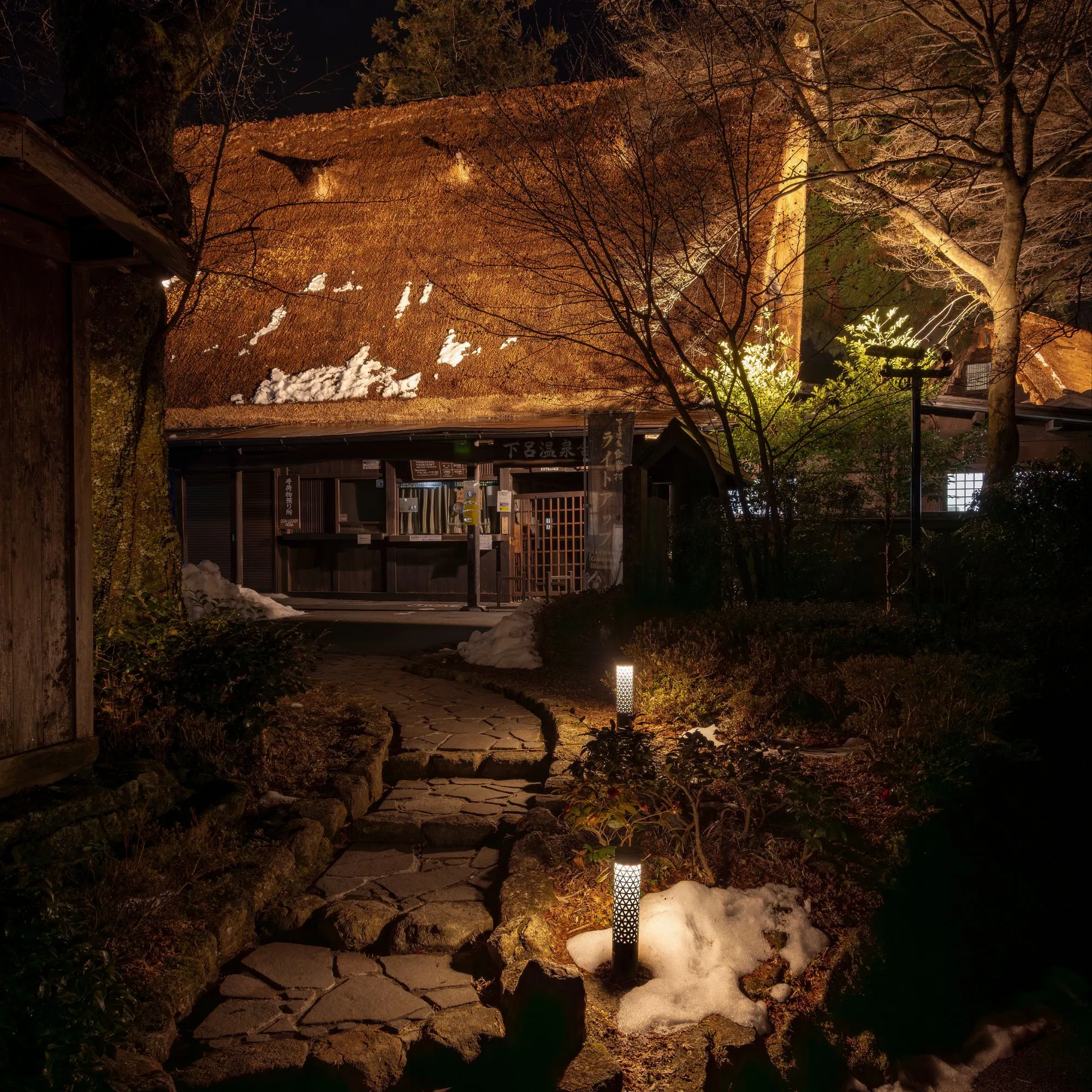 当初は器具レンタルによる仮設ライトアップとして計画がスタートしました。そのため、足元の導線照明として想定していたパススタンドライトは固定が必要のため採用できず、代替案としてツリースポットライトという小型スポットライトを用いた足元照明で検証を行うことに。実際に光を入れてみることで、明るさの感じ方や安全性、建物への影響を確認しながら、夜間営業に必要な最低限の照度を見極めていきました。仮設だからこそ、実験的に試し、調整できた部分も多く、そのプロセスが常設照明の精度を高めています。茅葺屋根のライトアップについても、事前に照射テストを実施。4方向から照らす構成のため、グレア(眩しさ)カットの調整は現地での細かな対応が不可欠でした。屋根を照らす光をあえて周囲の樹木にもわずかに漏らすことで、建物と自然が光でつながる夜景を形成しています。