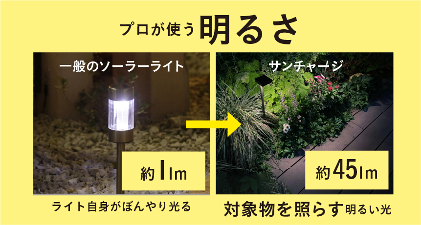 従来型ソーラーライト(当社LGS-98)の光束値が約1lmなのに対して「SUNCHARGE」は最大約45lm。足元や花壇に十分な明るさを届けます。さらに「SUNCHARGE」が採用するLEDはRa95の高演色。光の波長がより自然光に近く、本来の色合いを正しく再現できるため、花や緑を色鮮やかに照らします。