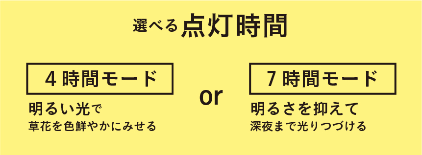 従来型ソーラーライトの場合、昼間に蓄えた電気を夜間、使い切ってしまうのに対して「SUNCHARGE」はタイマーでかしこく制御。明るい4時間点灯モード、または明るさを抑えた7時間点灯モードが選べ、余った電気は翌日以降に繰り越して使います。また満充電であれば3日間無日照が続いても点灯。毎日のあかりとして安心してご使用いただけます。