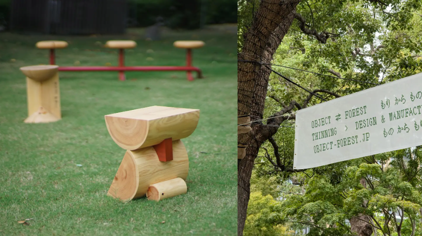 <OBJECT ⇄ FOREST>は、森の保全のために間伐した木材を活用し、国や自治体、林業従事者、生産加工者をつないで公共家具を作り、人々の暮らしへと届けるプロジェクトです。愛知県新城市にある井代の森で新城キッコリーズが間伐した、虫喰い材のような市場に流通しにくい材も取り入れながら、横関亮太氏がデザインしたスツールやベンチを、緑あふれるオープンガーデンで、実際に体験いただけます。