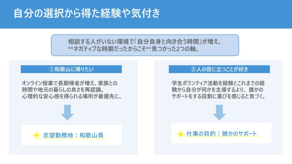 しかし、過去の選択を悔やむのではなく、「今の環境で自分が何を求め、何を目指すのか」を見つめ直したことで、「地元・和歌山に戻りたい、そして人の役に立ちたい」という思いが強まり、インターンシップを経て、タカショーデジテックへの入社を決意したと語りました。