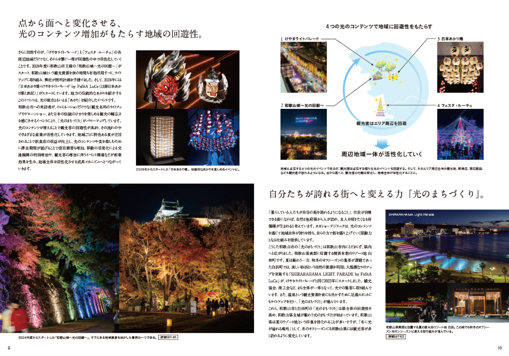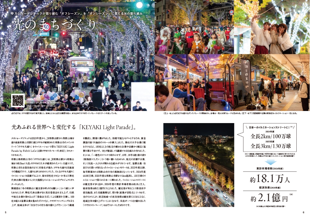 カタログでは、和歌山市のけやき大通りを彩る国内最大級のイルミネーションストリート「KEYAKI Light Parade by FeStA LuCe」にて、2024年度に累計来場者数約18.1万人・経済効果約2.1億円を記録した実績など、光のまちづくりの具体的な成果をご紹介しています。
