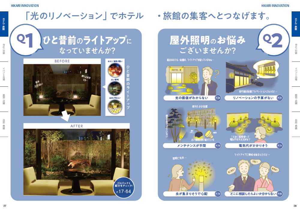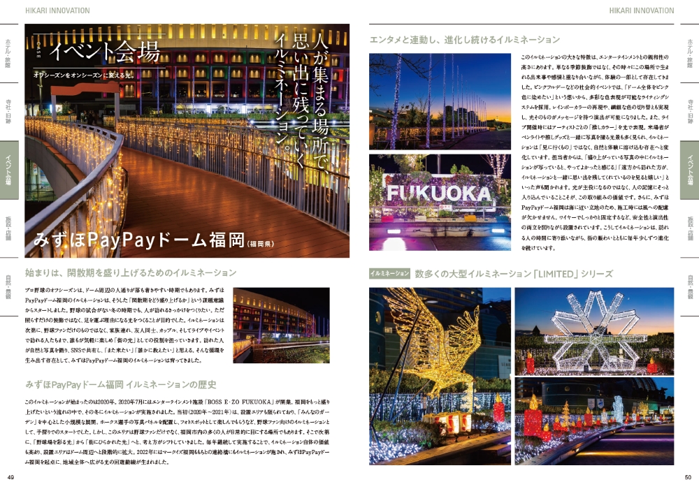 また、ホテル・旅館、寺社・旧跡、イベント会場、施設・店舗、自然・景観という5つのカテゴリーで、全国20を超える施工事例を掲載。浅草寺や下呂温泉合掌村、みずほPayPayドーム福岡、和歌山城など、多彩な現場での照明計画の考え方や演出手法を、ビフォーアフターの写真とともに詳しく解説しています。
