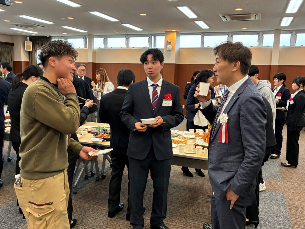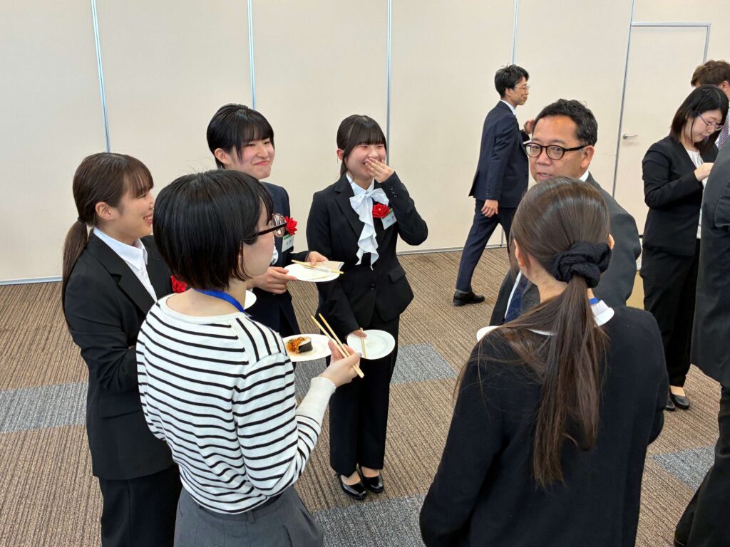式典後には、新入社員と若手社員を中心とした交流の場が設けられました。仕事のことや学生時代、プライベートの話題も交えながら、さまざまな意見交換が行われ、有意義な時間となりました。