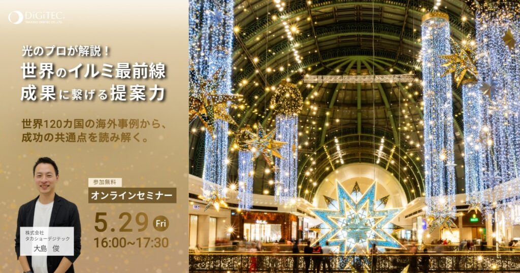 株式会社タカショーデジテックは、イルミネーションの世界的トレンドがわかる「MK Illumination Webセミナー 2026 世界のクリスマスを、日本の夜に。」を、5月29日(金)に開催いたします。これは、昨年度に初開催し、ご好評をいただいたWebセミナーの第2弾で、「今年も最新のトレンドを知りたい」「より多くの事例を紹介してほしい」といったご要望を受け、さらに充実した内容で開催いたします。